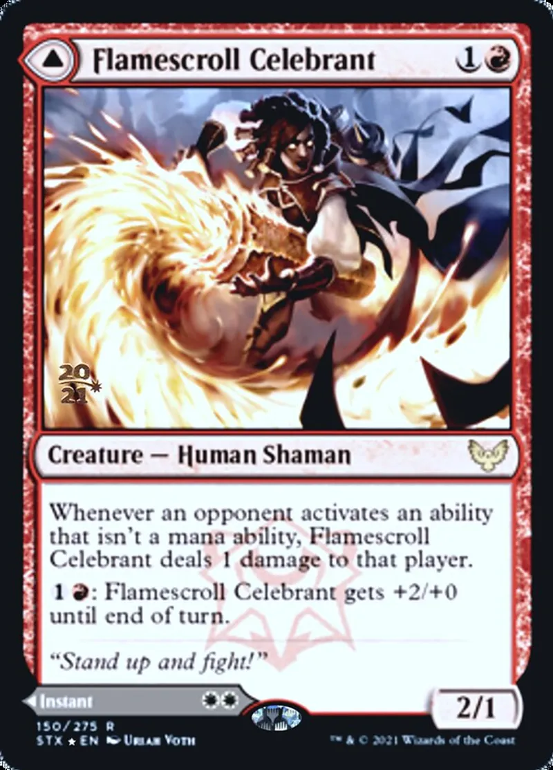 | Oracle Text | Whenever an opponent activates an ability that isn’t a mana ability, Flamescroll Celebrant deals 1 damage to that player.