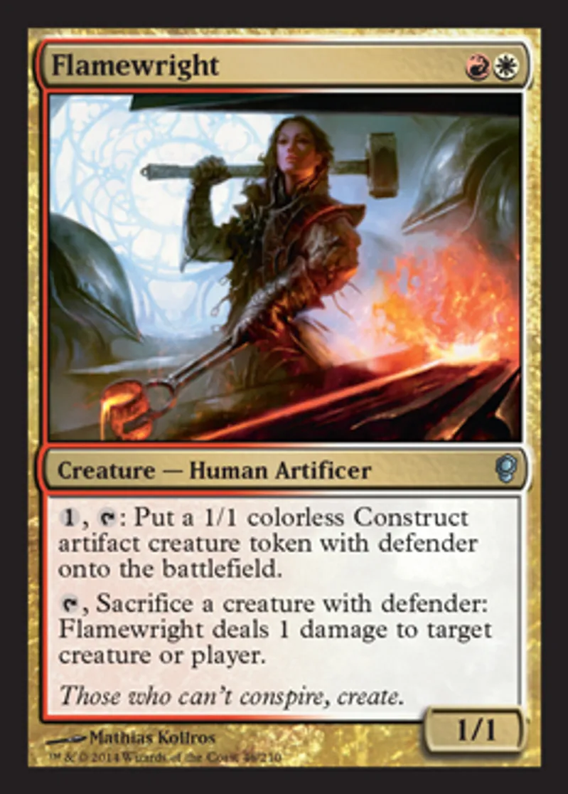 | Oracle Text | {{1}}, {{t}}: Put a 1/1 colorless Construct artifact creature token with defender onto the battlefield. {{t}}, Sacrifice a creature with defender: Flamewright deals 1 damage to target creature or player. | ||