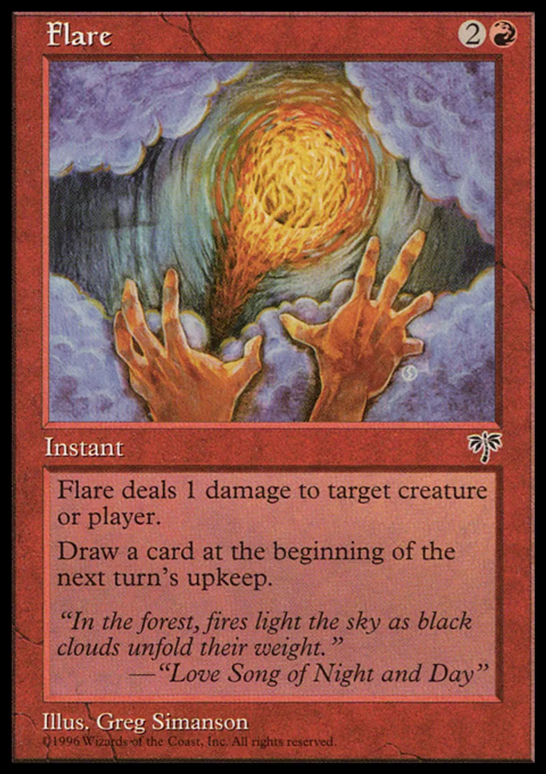 | Oracle Text | Flare deals 1 damage to target creature or player. Draw a card at the beginning of the next turn's upkeep. | ||