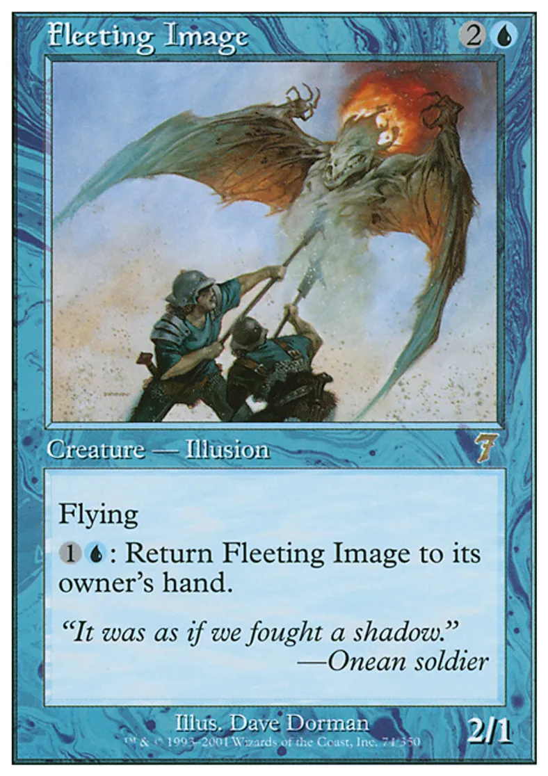 | Oracle Text | Flying (This creature can't be blocked except by creatures with flying or reach.) {{1}}{{u}}: Return Fleeting Image to its owner's hand. | ||