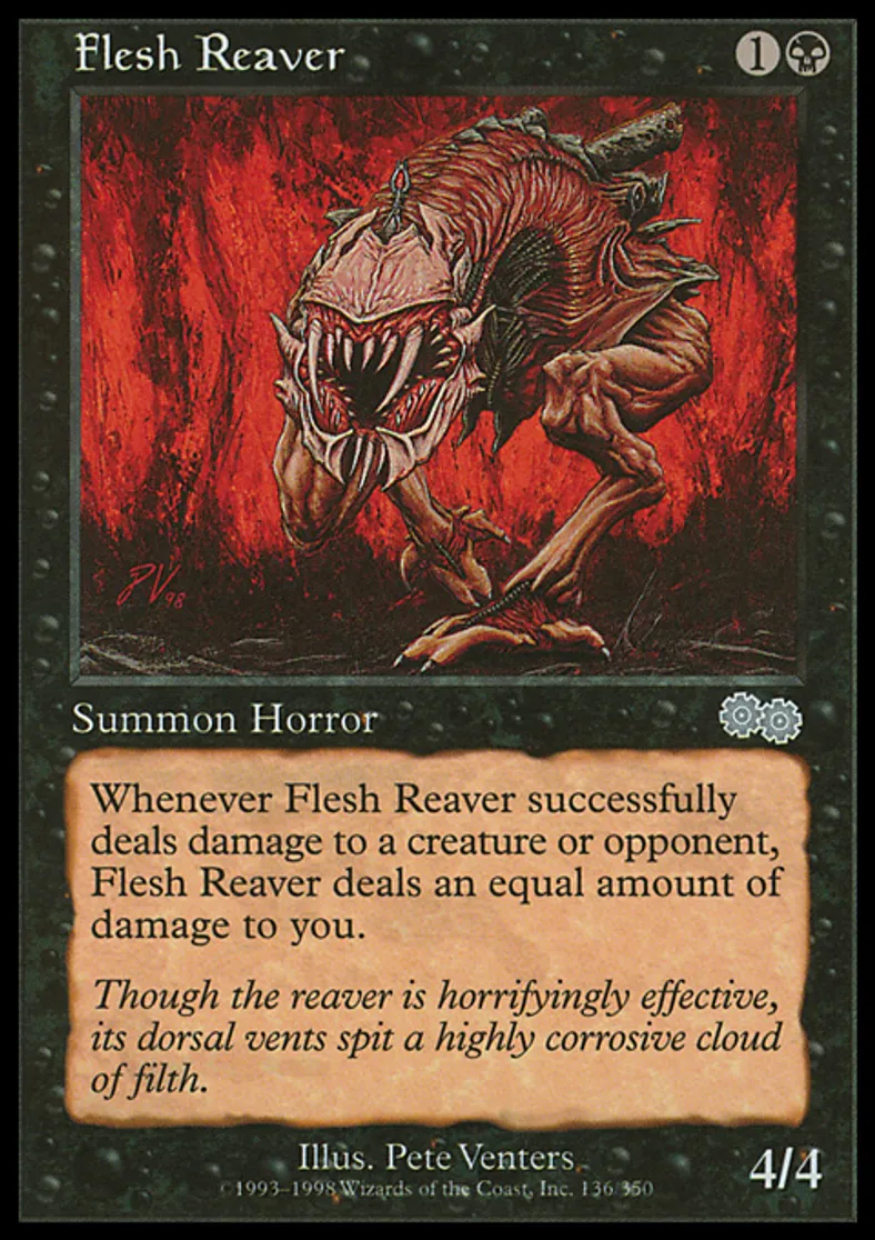 | Oracle Text | Whenever Flesh Reaver deals damage to a creature or opponent, Flesh Reaver deals that much damage to you. | ||
