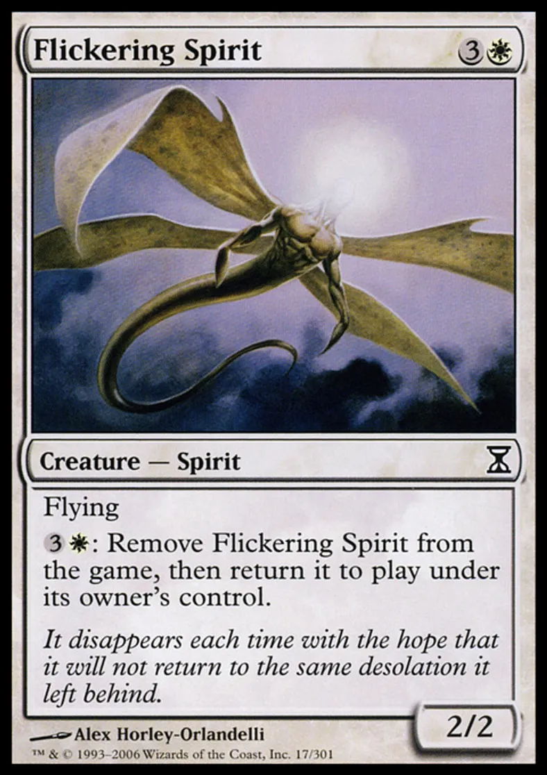 | Oracle Text | Flying {{3}}{{w}}: Exile Flickering Spirit, then return it to the battlefield under its owner's control. | ||