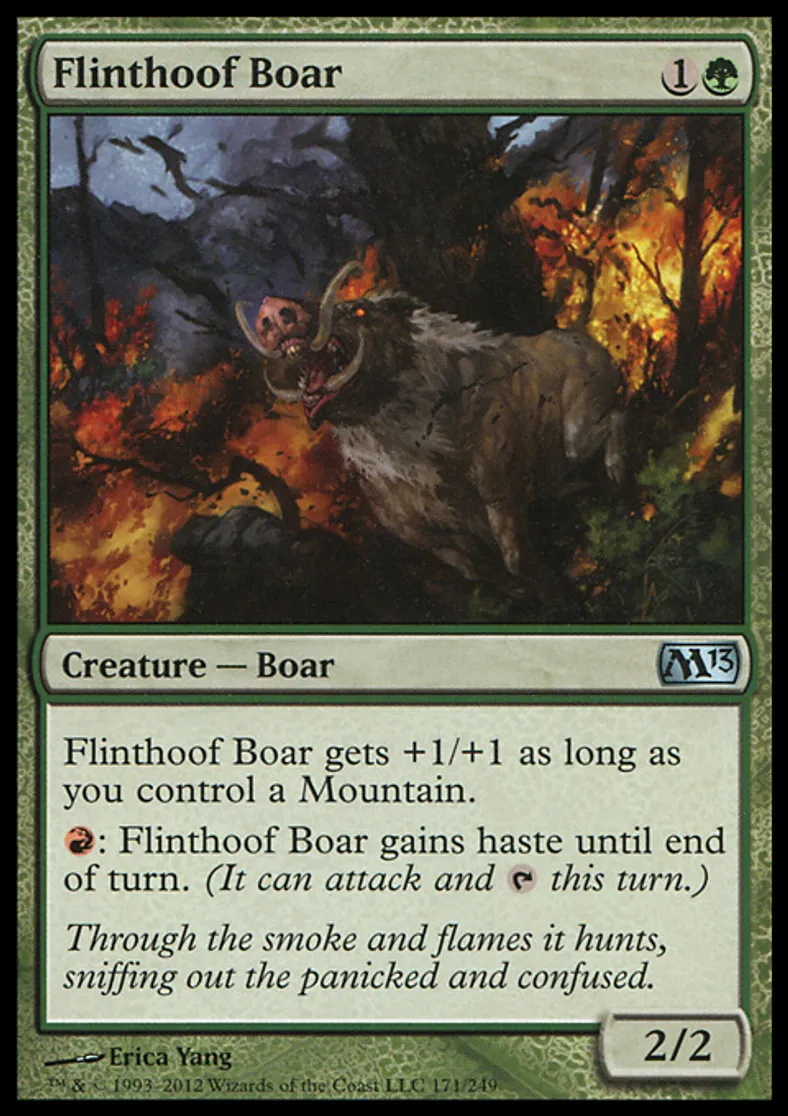 | Oracle Text | Flinthoof Boar gets +1/+1 as long as you control a Mountain. {{r}}: Flinthoof Boar gains haste until end of turn. (It can attack and {{t}} this turn.) | ||
