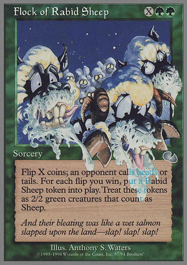 | Oracle Text | Flip X coins; an opponent calls heads or tails. For each flip you win, put a Rabid Sheep token into play. Treat these tokens as 2/2 green creatures that count as Sheep. | ||
