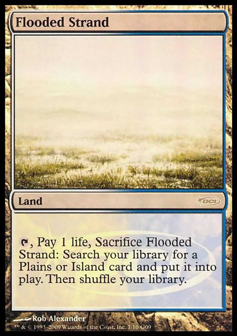 | Oracle Text | {T}, Pay 1 life, Sacrifice Flooded Strand: Search your library for a Plains or Island card and put it onto the battlefield. Then shuffle your library. | ||
