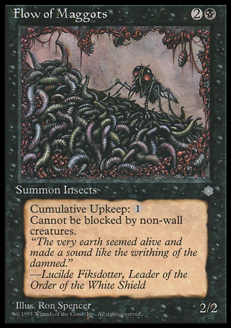 | Oracle Text | Cumulative upkeep {{1}} (At the beginning of your upkeep, put an age counter on this permanent, then sacrifice it unless you pay its upkeep cost for each age counter on it.) Flow of Maggots can't be blocked by non-Wall creatures. | ||