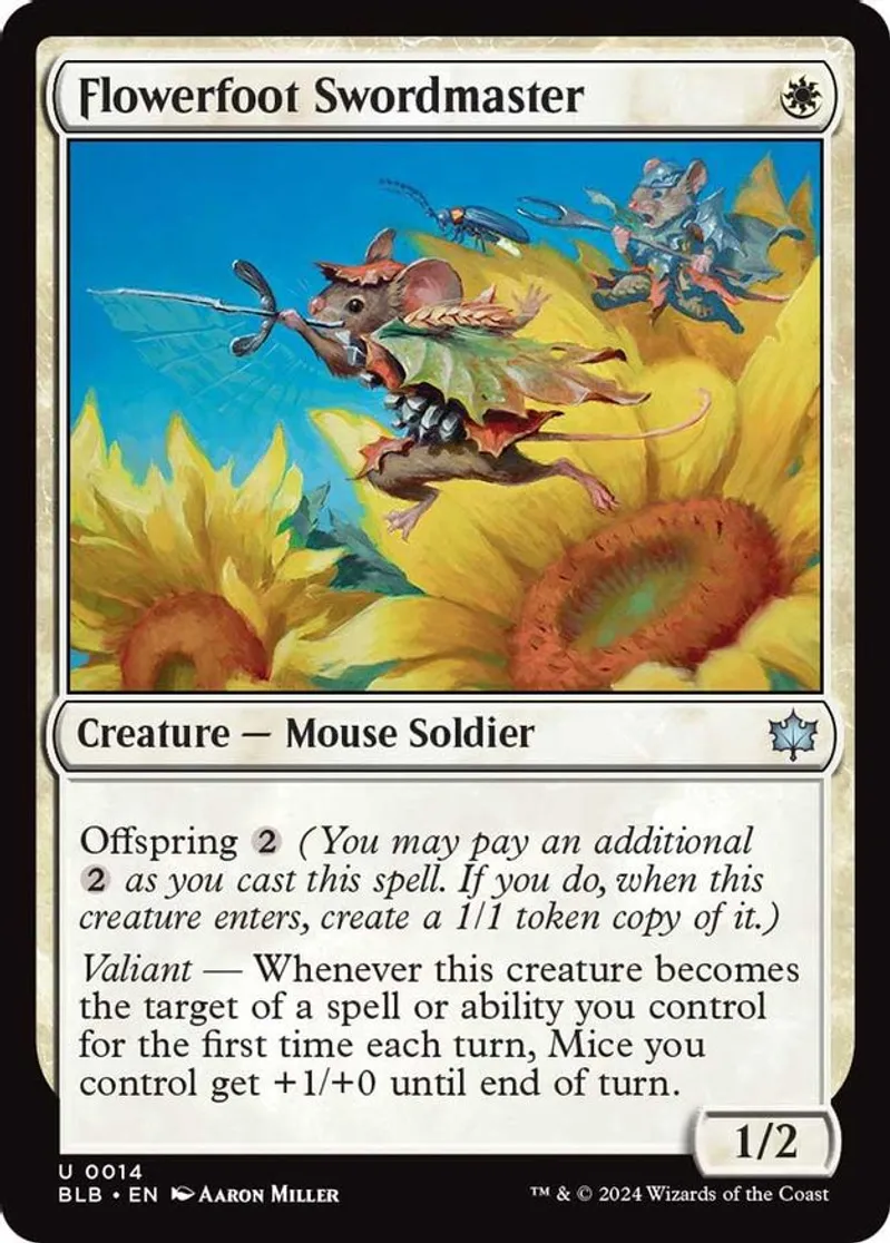Magic: the Gathering (mtg) Uncommon creature — mouse soldier Flowerfoot Swordmaster from Bloomburrow (BLB) last updated 2026-02-21 15:23:32