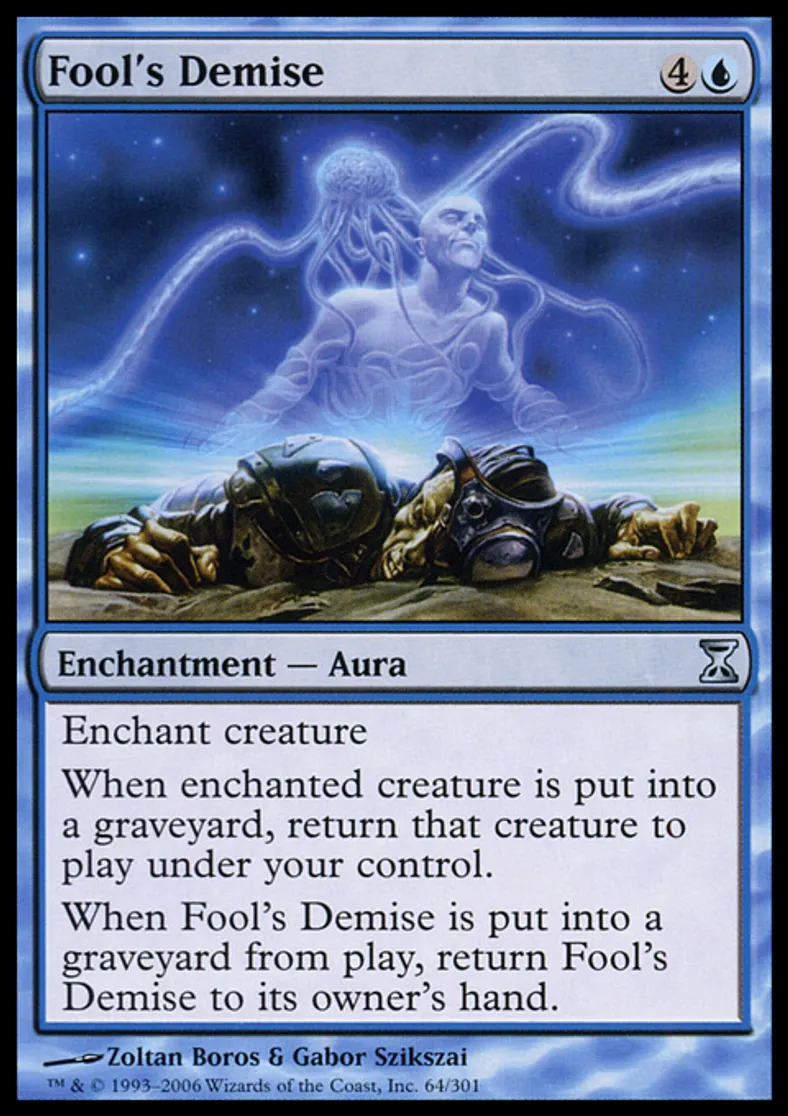 | Oracle Text | Enchant creature When enchanted creature dies, return that card to the battlefield under your control. When Fool's Demise is put into a graveyard from the battlefield, return Fool's Demise to its owner's hand. | ||