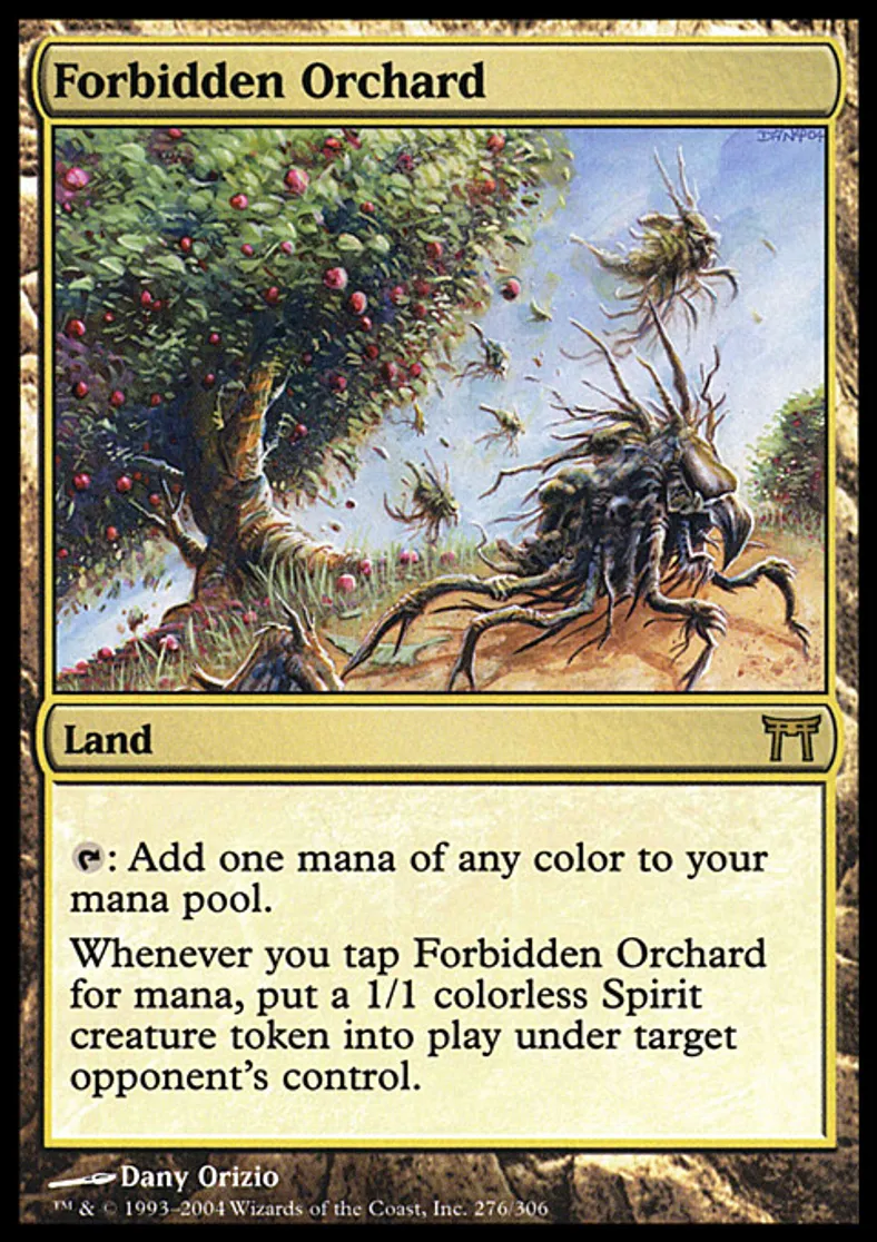 | Oracle Text | {{t}}: Add one mana of any color to your mana pool. Whenever you tap Forbidden Orchard for mana, put a 1/1 colorless Spirit creature token onto the battlefield under target opponent's control. | ||