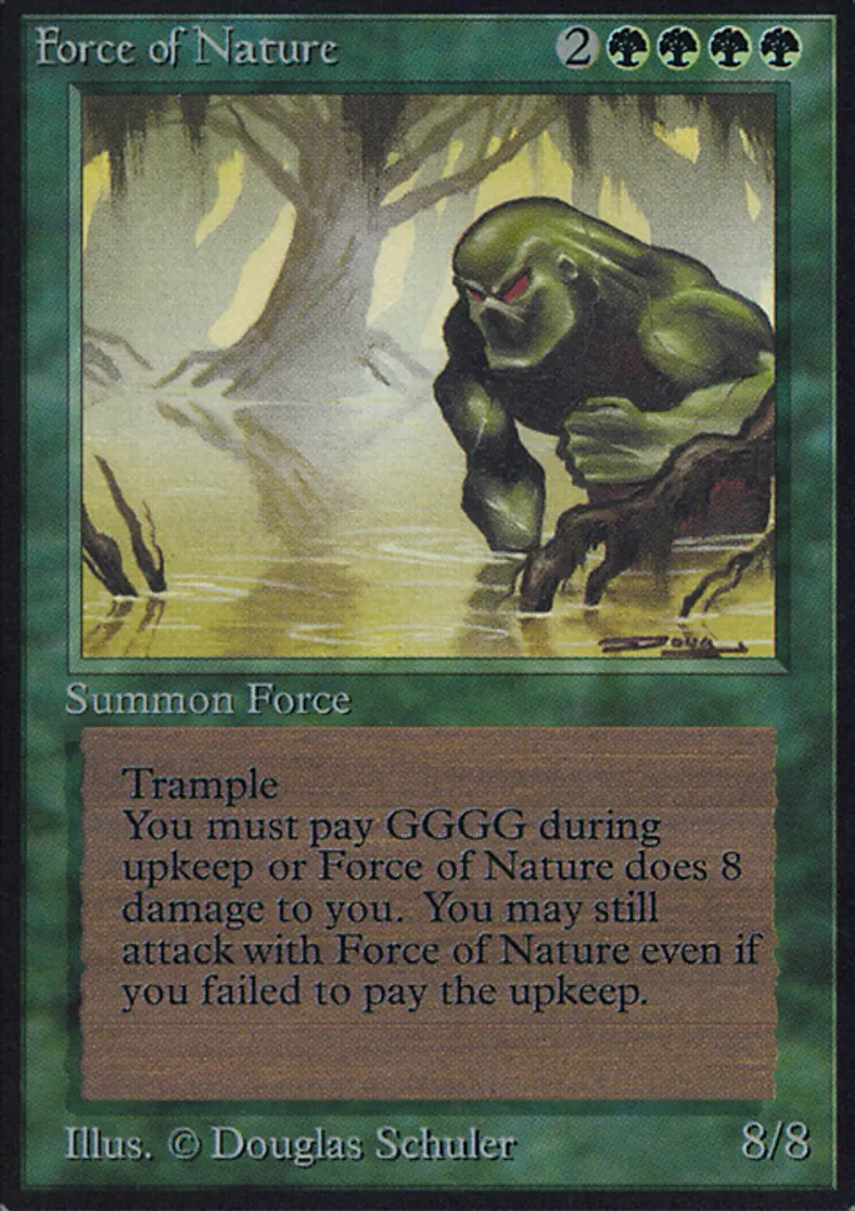 | Oracle Text | Trample (If this creature would assign enough damage to its blockers to destroy them, you may have it assign the rest of its damage to defending player or planeswalker.) At the beginning of your upkeep, Force of Nature deals 8 damage to you unless you pay {{g}}{{g}}{{g}}{{g}}. | ||