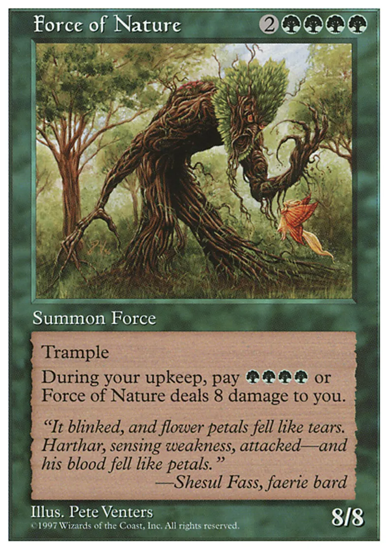 | Oracle Text | Trample (If this creature would assign enough damage to its blockers to destroy them, you may have it assign the rest of its damage to defending player or planeswalker.) At the beginning of your upkeep, Force of Nature deals 8 damage to you unless you pay {{g}}{{g}}{{g}}{{g}}. | ||