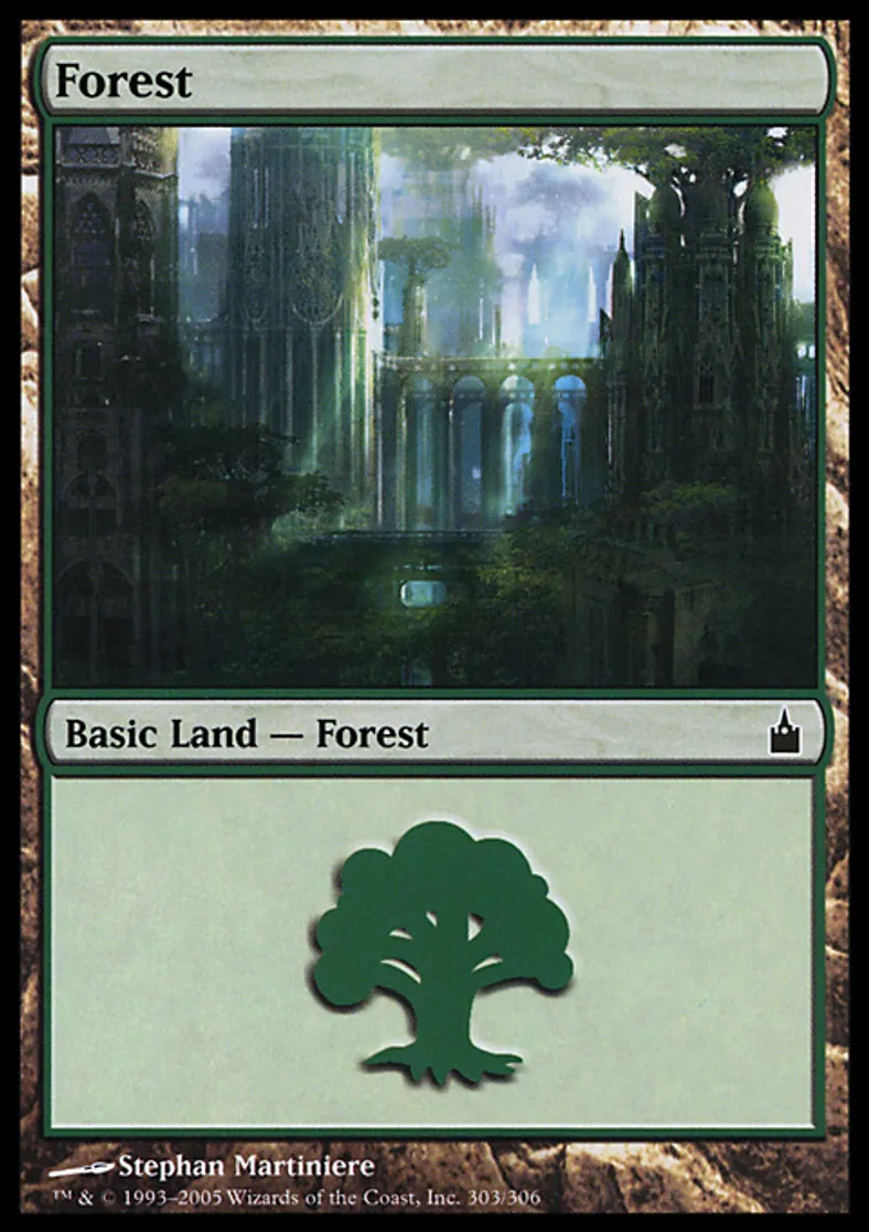 Forest (303) is a Basic Land in the set Ravnica: City of Guilds.