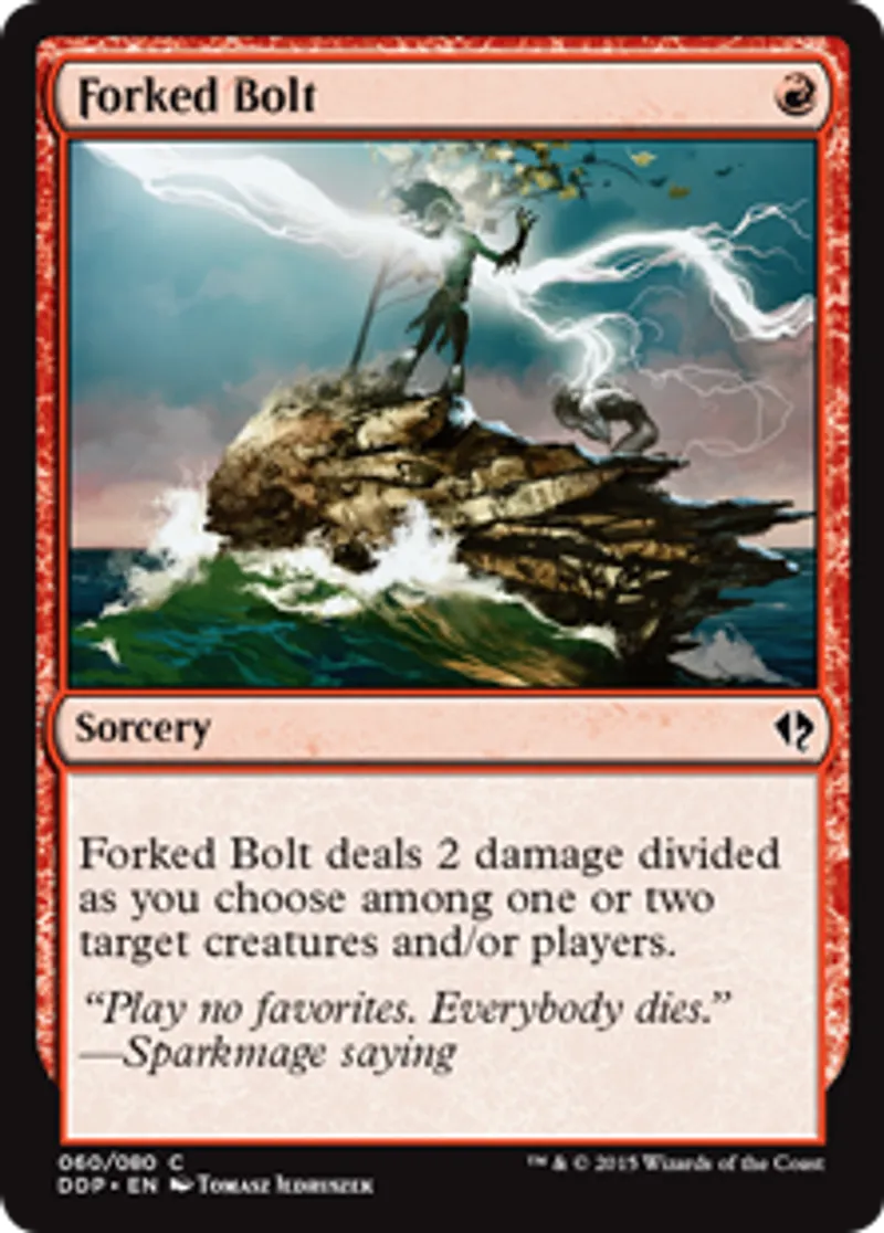 | Oracle Text | Forked Bolt deals 2 damage divided as you choose among one or two target creatures and/or players. | ||