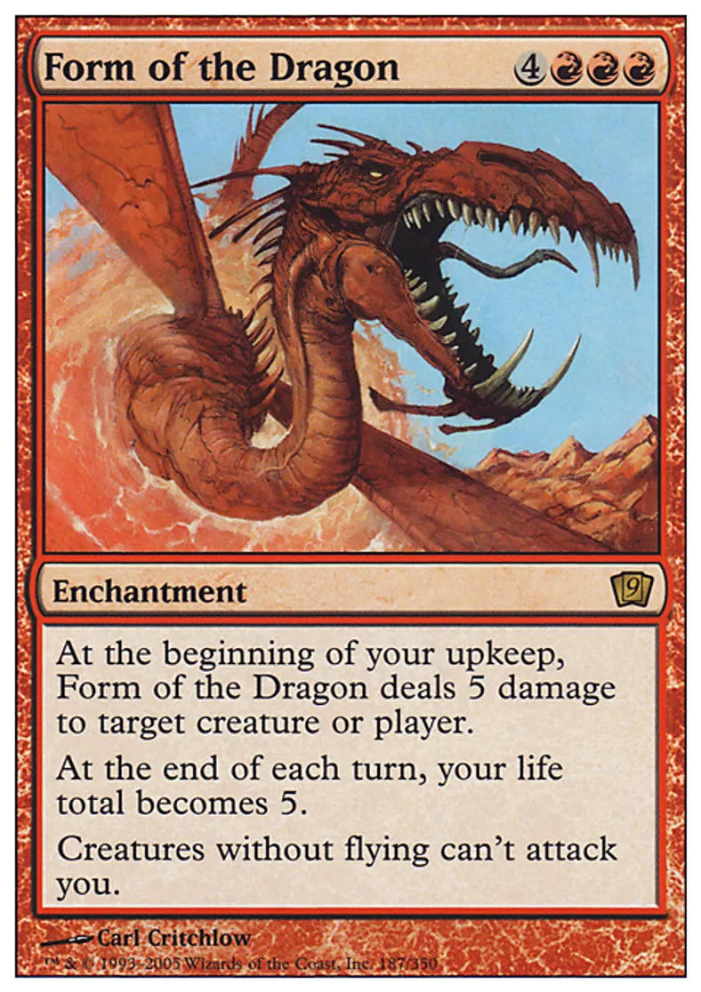 | Oracle Text | At the beginning of your upkeep, Form of the Dragon deals 5 damage to target creature or player. At the beginning of each end step, your life total becomes 5. Creatures without flying can't attack you. | ||