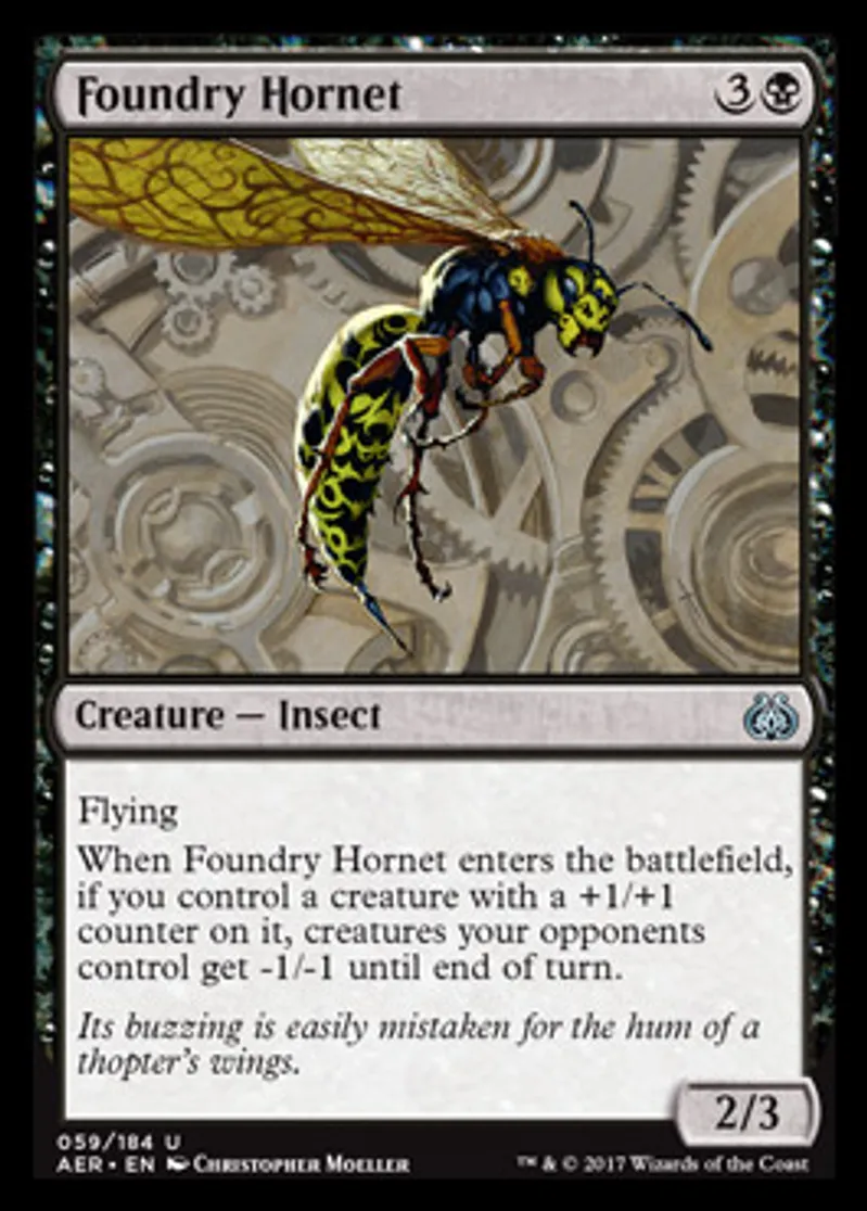 | Oracle Text | Flying When Foundry Hornet enters the battlefield, if you control a creature with a +1/+1 counter on it, creatures your opponents control get -1/-1 until end of turn. | ||