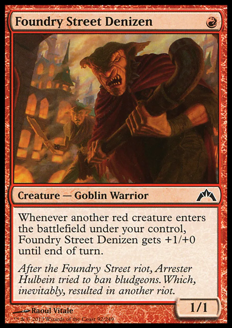 | Oracle Text | Whenever another red creature enters the battlefield under your control, Foundry Street Denizen gets +1/+0 until end of turn. | ||