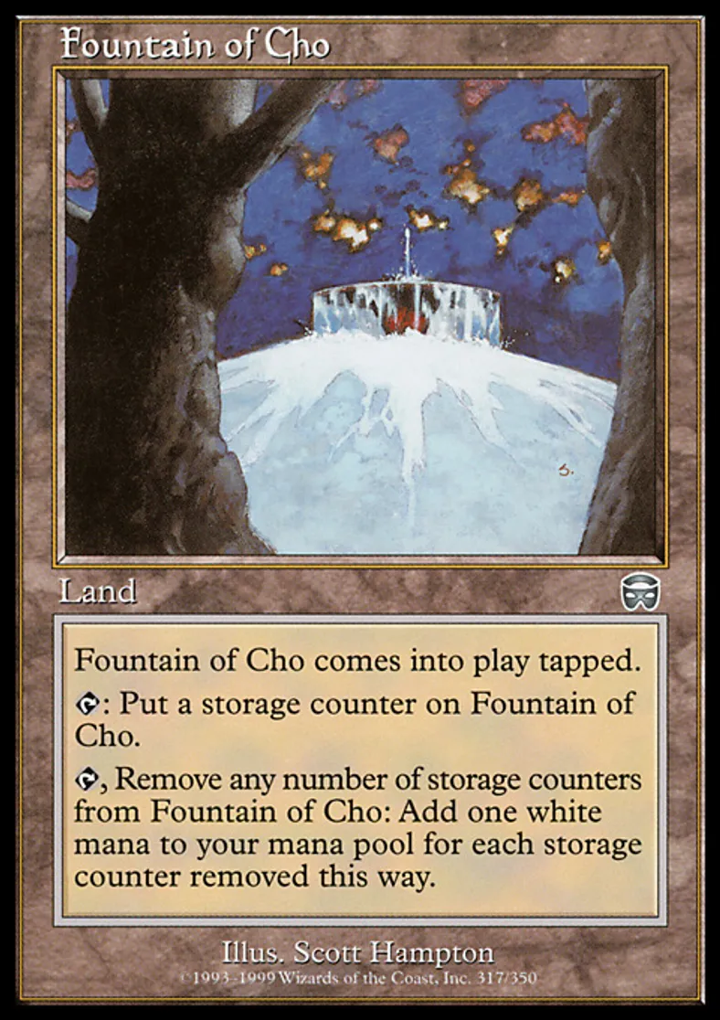| Oracle Text | Fountain of Cho enters the battlefield tapped. {{t}}: Put a storage counter on Fountain of Cho. {{t}}, Remove any number of storage counters from Fountain of Cho: Add {{w}} to your mana pool for each storage counter removed this way. | ||
