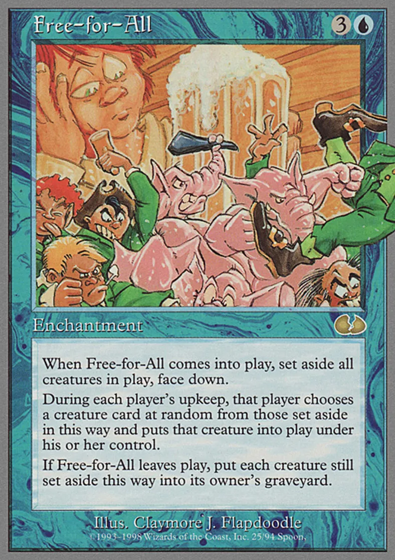 | Oracle Text | When Free-for-All comes into play, set aside all creatures in play, face down. During each player's upkeep, that player chooses a creature card at random from those set aside in this way and puts that creature into play under his or her control. If Free-for-All leaves play, put each creature still set aside this way into its owner's graveyard. | ||