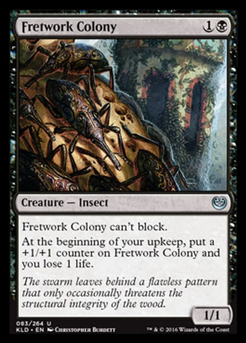 | Oracle Text | Fretwork Colony can't block. At the beginning of your upkeep, put a +1/+1 counter on Fretwork Colony and you lose 1 life. | ||