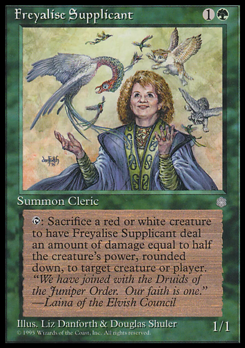 | Oracle Text | {{t}}, Sacrifice a red or white creature: Freyalise Supplicant deals damage to target creature or player equal to half the sacrificed creature's power, rounded down. | ||
