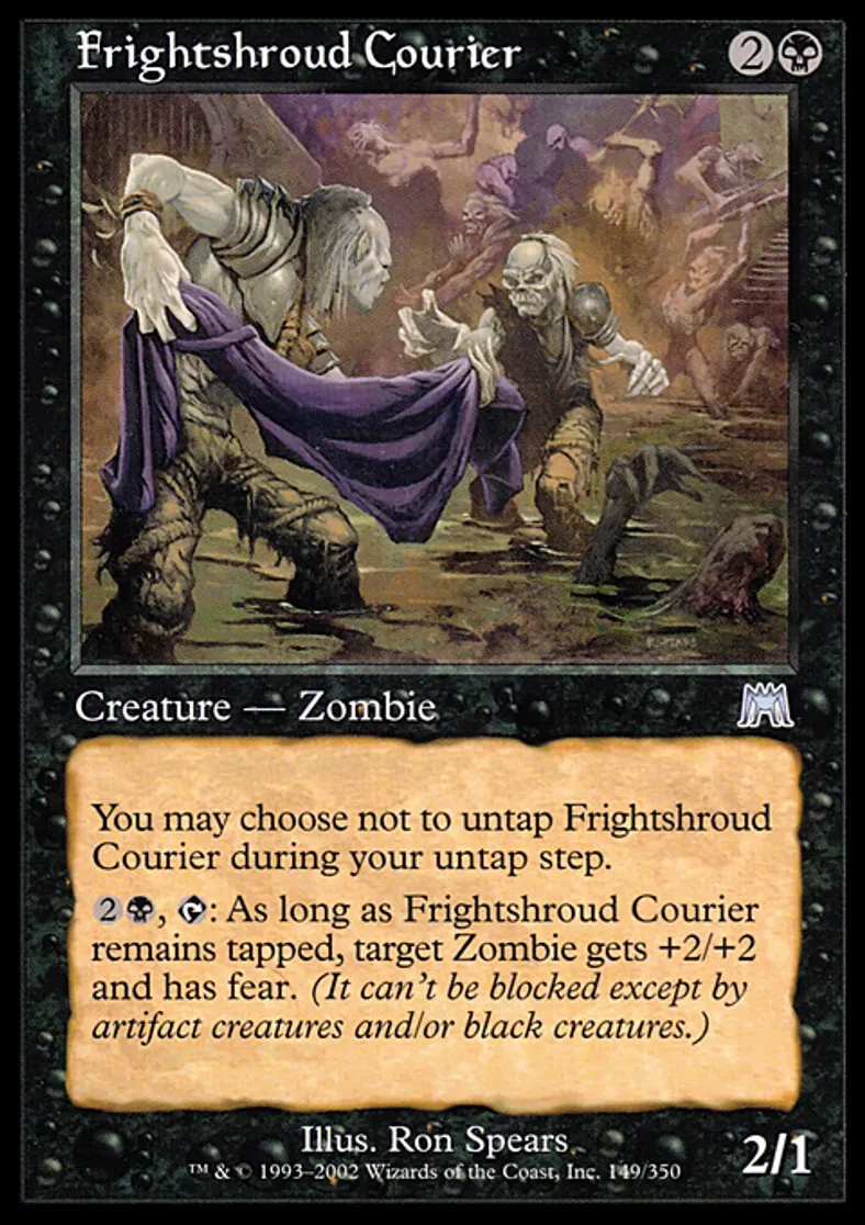 | Oracle Text | You may choose not to untap Frightshroud Courier during your untap step. {{2}}{{b}}, {{t}}: Target Zombie creature gets +2/+2 and has fear for as long as Frightshroud Courier remains tapped. (It can't be blocked except by artifact creatures and/or black creatures.) | ||