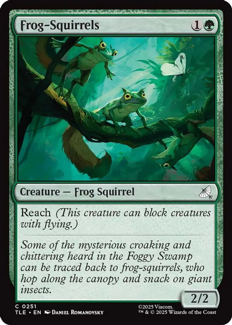| Flavor Text | <em>some of the mysterious croaking and chittering heard in the foggy swamp can be traced back to frog-squirrels, who hop along the canopy and snack on giant insects.</em> | ||