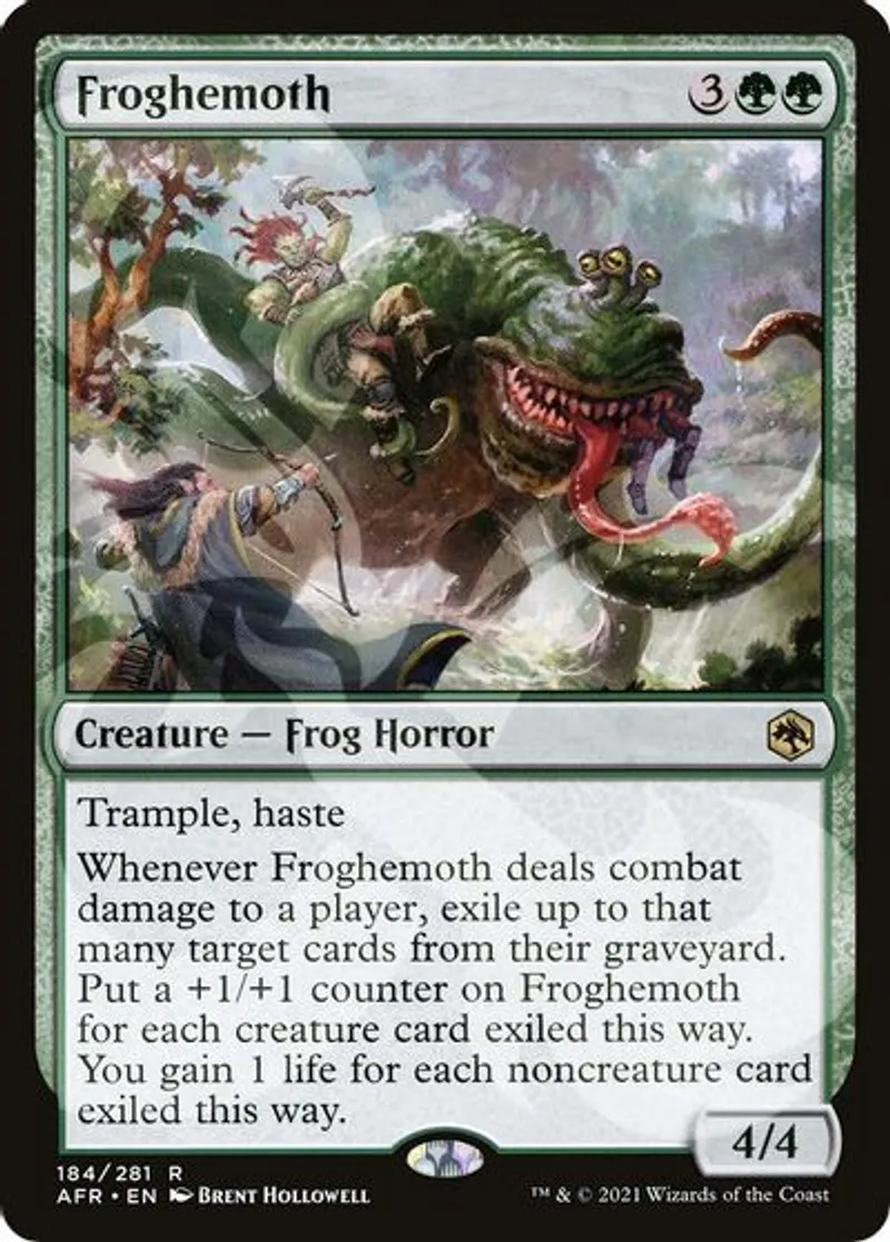 Whenever Froghemoth deals combat damage to a player, exile up to that many target cards from their graveyard. Put a +1/+1 counter on Froghemoth for each creature card exiled this way. You gain 1 life for each noncreature card exiled this way. | ||