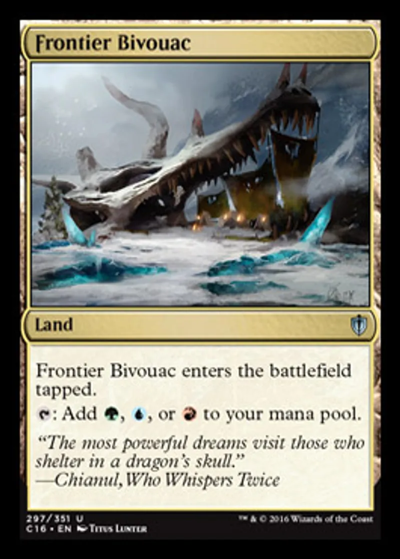| Oracle Text | Frontier Bivouac enters the battlefield tapped. {{t}}: Add {{g}}, {{u}}, or {{r}} to your mana pool. | ||