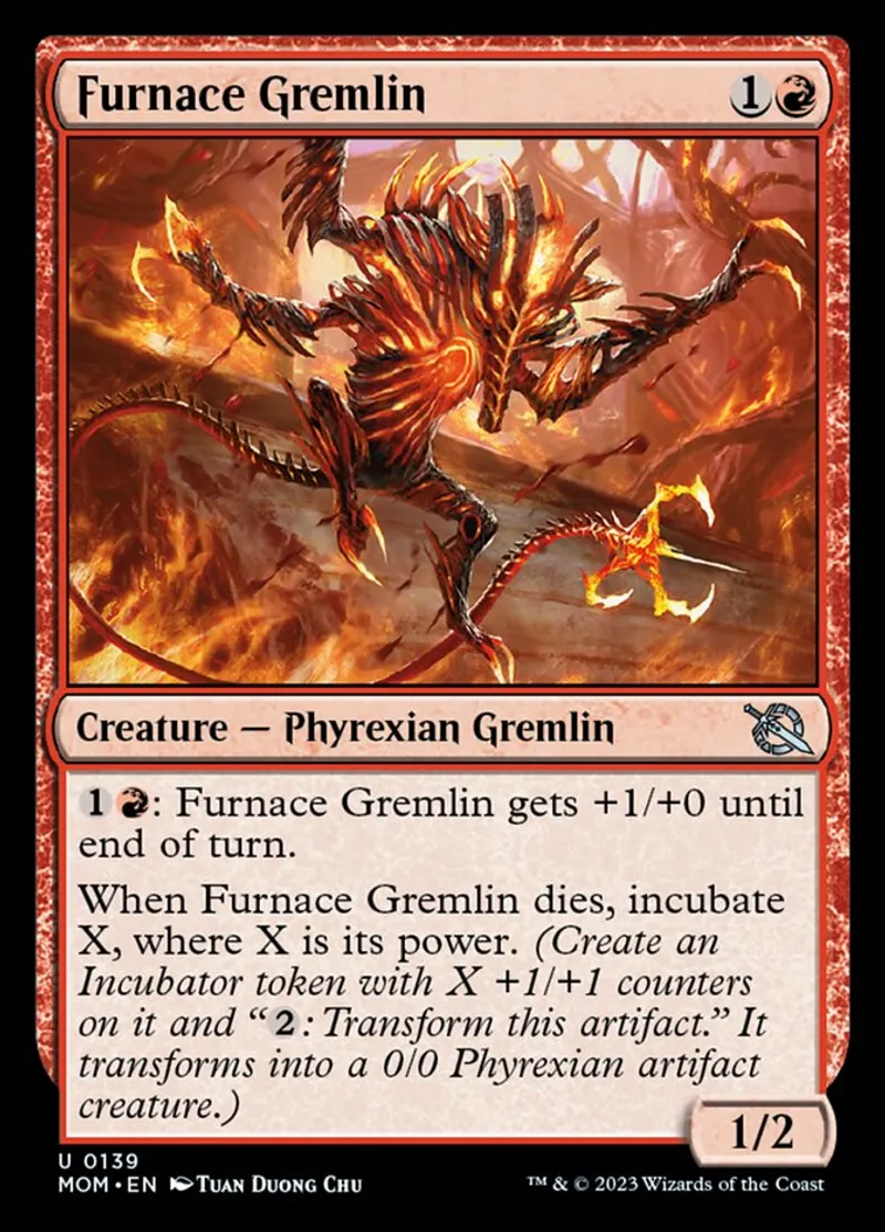 When Furnace Gremlin dies, incubate X, where X is its power. (Create an Incubator token with X +1/+1 counters on it and "2: Transform this artifact." It transforms into a 0/0 Phyrexian artifact creature.) | ||
