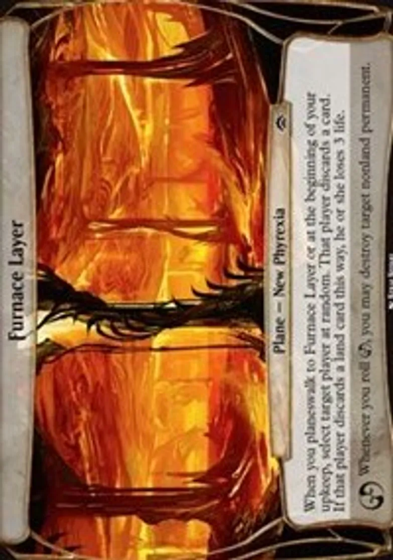 | Oracle Text | When you planeswalk to Furnace Layer or at the beginning of your upkeep, select target player at random. That player discards a card. If that player discards a land card this way, he or she loses 3 life.