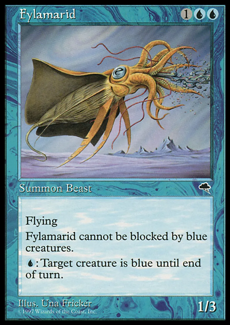 | Oracle Text | Flying Fylamarid can't be blocked by blue creatures. {{u}}: Target creature becomes blue until end of turn. | ||