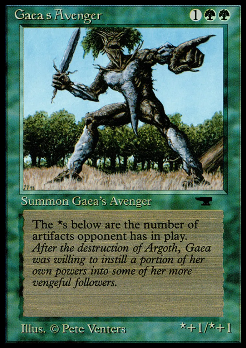 | Oracle Text | Gaea's Avenger's power and toughness are each equal to 1 plus the number of artifacts your opponents control. | ||