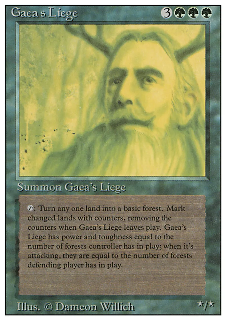 | Oracle Text | As long as Gaea's Liege isn't attacking, its power and toughness are each equal to the number of Forests you control. As long as Gaea's Liege is attacking, its power and toughness are each equal to the number of Forests defending player controls. {{t}}: Target land becomes a Forest until Gaea's Liege leaves the battlefield. | ||