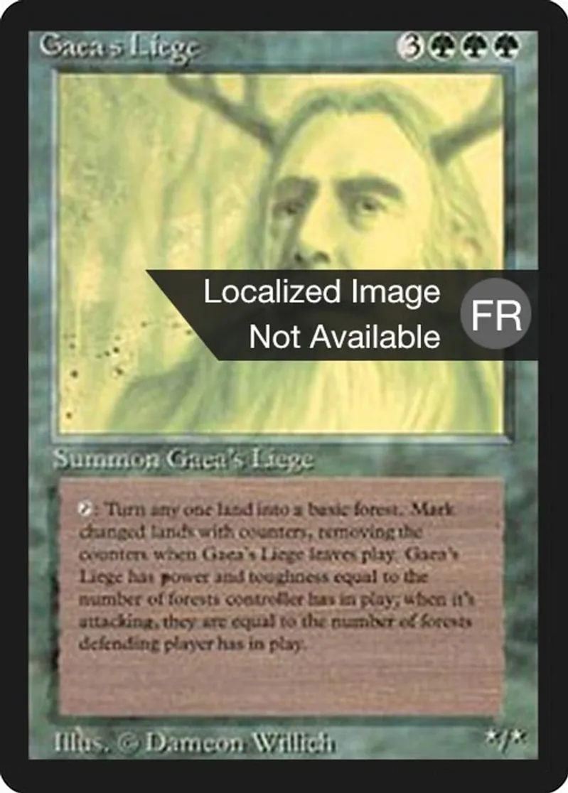 | Oracle Text | As long as Gaea's Liege isn't attacking, its power and toughness are each equal to the number of Forests you control. As long as Gaea's Liege is attacking, its power and toughness are each equal to the number of Forests defending player controls.