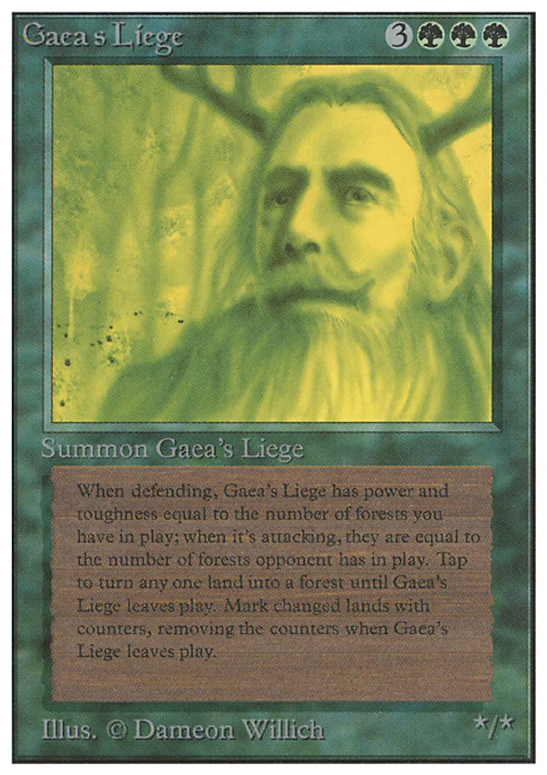 | Oracle Text | As long as Gaea's Liege isn't attacking, its power and toughness are each equal to the number of Forests you control. As long as Gaea's Liege is attacking, its power and toughness are each equal to the number of Forests defending player controls. {{t}}: Target land becomes a Forest until Gaea's Liege leaves the battlefield. | ||