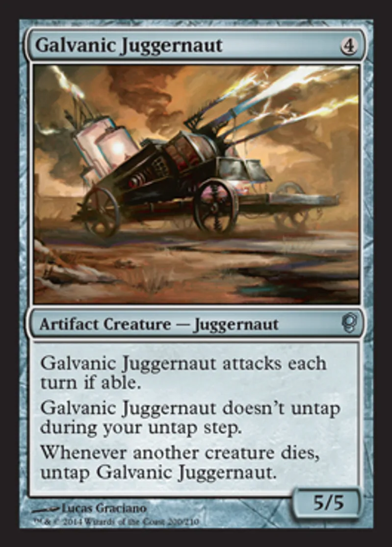 | Oracle Text | Galvanic Juggernaut attacks each turn if able. Galvanic Juggernaut doesn't untap during your untap step. Whenever another creature dies, untap Galvanic Juggernaut. | ||
