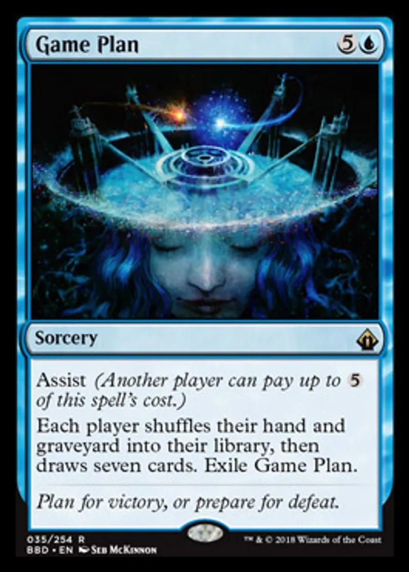 | Oracle Text | Assist (Another player can pay up to {{5}} of this spell's cost.) Each player shuffles their hand and graveyard into their library, then draws seven cards. Exile Game Plan. | ||
