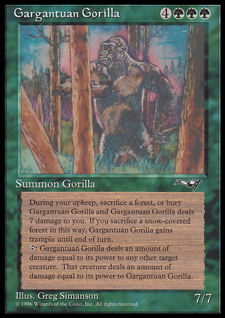 | Oracle Text | At the beginning of your upkeep, you may sacrifice a Forest. If you sacrifice a snow Forest this way, Gargantuan Gorilla gains trample until end of turn. If you don't sacrifice a Forest, sacrifice Gargantuan Gorilla and it deals 7 damage to you. {{t}}: Gargantuan Gorilla deals damage equal to its power to another target creature. That creature deals damage equal to its power to Gargantuan Gorilla. | ||
