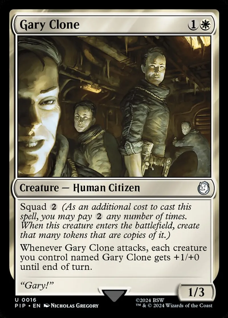 Magic: the Gathering (mtg) uncommon Creature — Human Citizen Gary Clone from Universes Beyond: Fallout (pip) last updated 2026-02-21 15:57:32