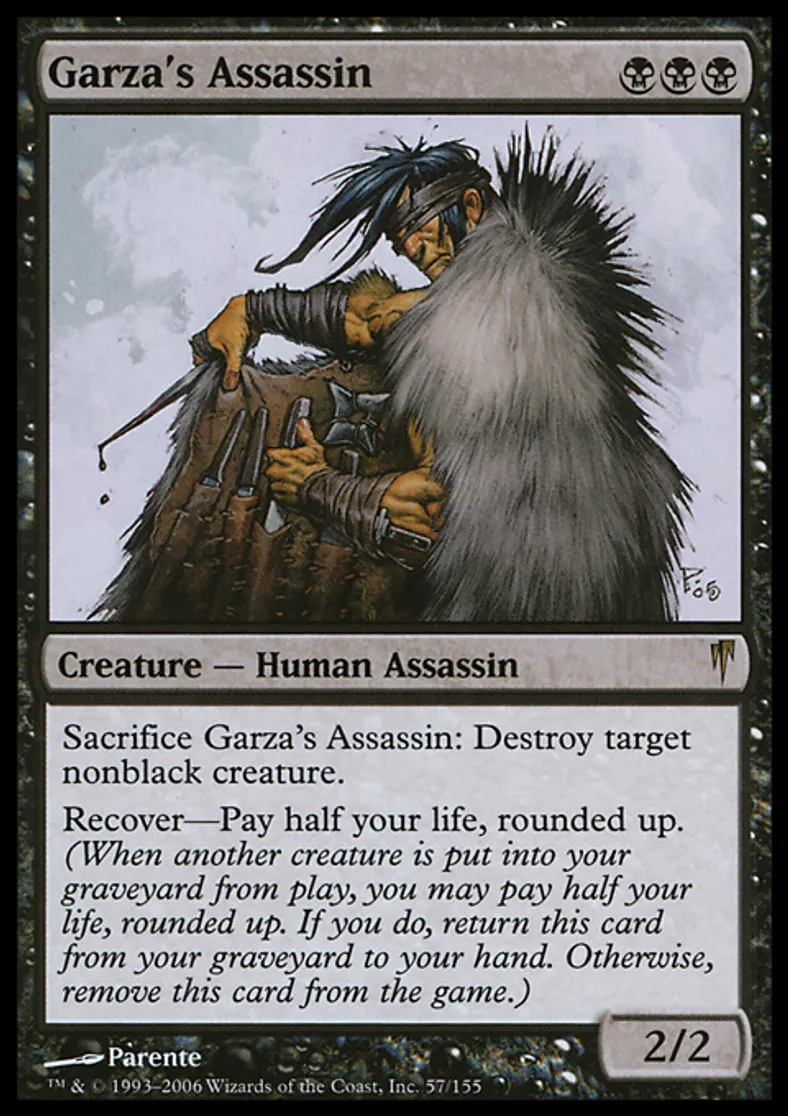 | Oracle Text | Sacrifice Garza's Assassin: Destroy target nonblack creature. Recover—Pay half your life, rounded up. (When another creature is put into your graveyard from the battlefield, you may pay half your life, rounded up. If you do, return this card from your graveyard to your hand. Otherwise, exile this card.) | ||