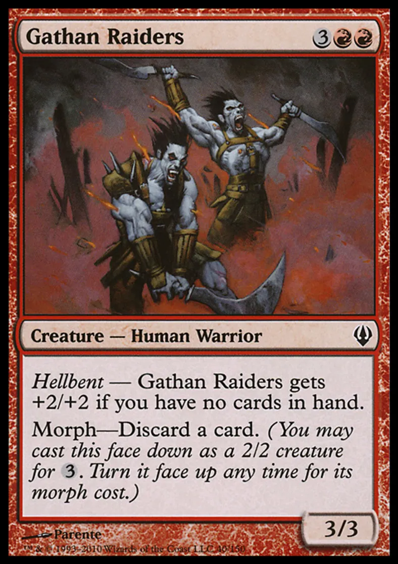 | Oracle Text | Hellbent — Gathan Raiders gets +2/+2 as long as you have no cards in hand. Morph—Discard a card. (You may cast this face down as a 2/2 creature for {{3}}. Turn it face up any time for its morph cost.) | ||