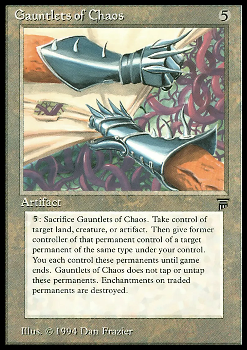 | Oracle Text | {{5}}, Sacrifice Gauntlets of Chaos: Exchange control of target artifact, creature, or land you control and target permanent an opponent controls that shares one of those types with it. If those permanents are exchanged this way, destroy all Auras attached to them. | ||