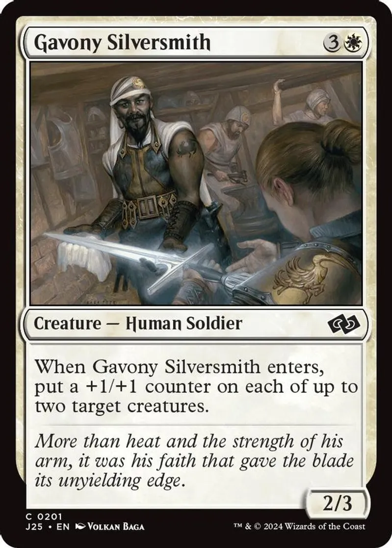 Magic: the Gathering (mtg) Common creature — human soldier Gavony Silversmith from Foundations Jumpstart (J25) last updated 2026-02-21 15:33:32