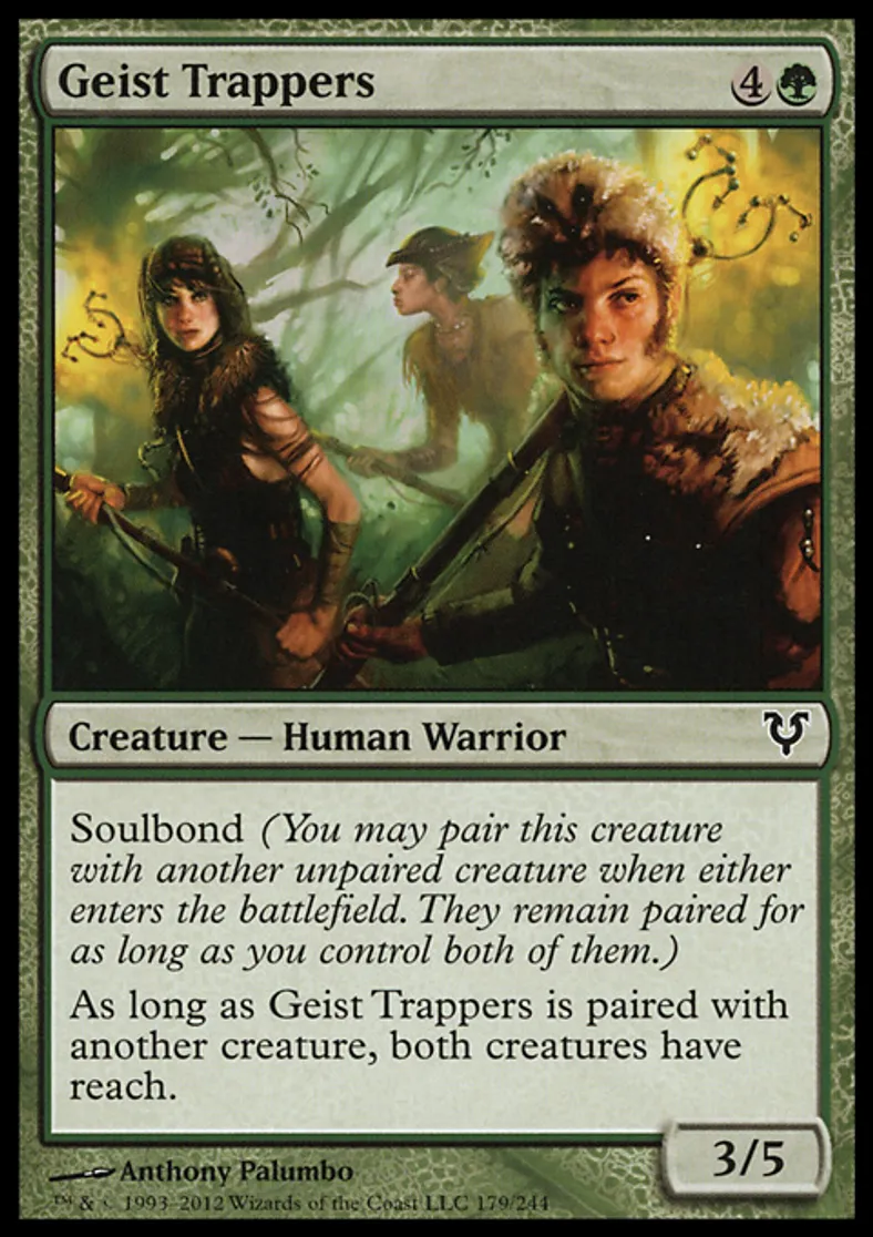 | Oracle Text | Soulbond (You may pair this creature with another unpaired creature when either enters the battlefield. They remain paired for as long as you control both of them.) As long as Geist Trappers is paired with another creature, both creatures have reach. | ||