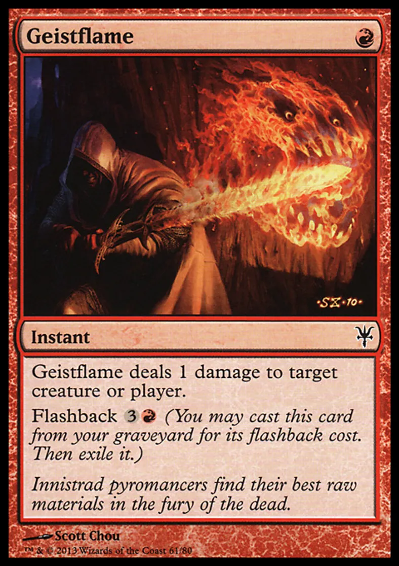 | Oracle Text | Geistflame deals 1 damage to target creature or player. Flashback {{3}}{{r}} (You may cast this card from your graveyard for its flashback cost. Then exile it.) | ||