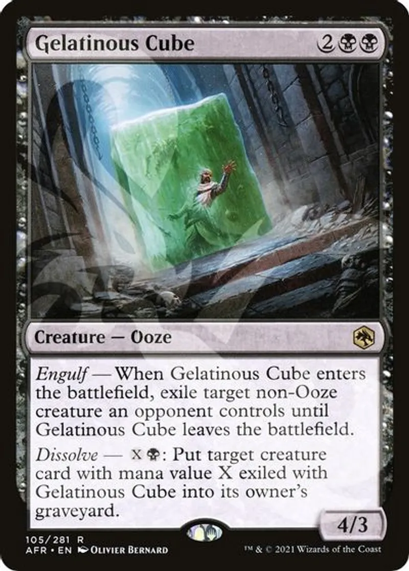 | Oracle Text | Engulf — When Gelatinous Cube enters the battlefield, exile target non-Ooze creature an opponent controls until Gelatinous Cube leaves the battlefield.