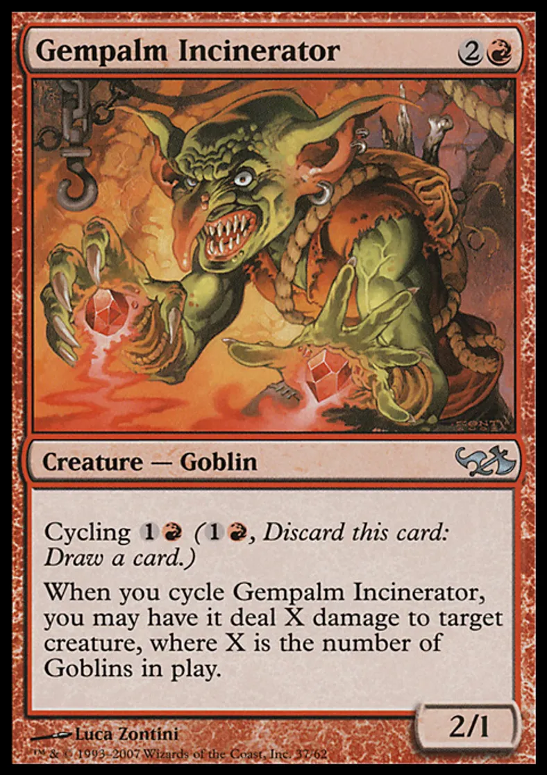 | Oracle Text | Cycling {{1}}{{r}} ({{1}}{{r}}, Discard this card: Draw a card.) When you cycle Gempalm Incinerator, you may have it deal X damage to target creature, where X is the number of Goblins on the battlefield. | ||