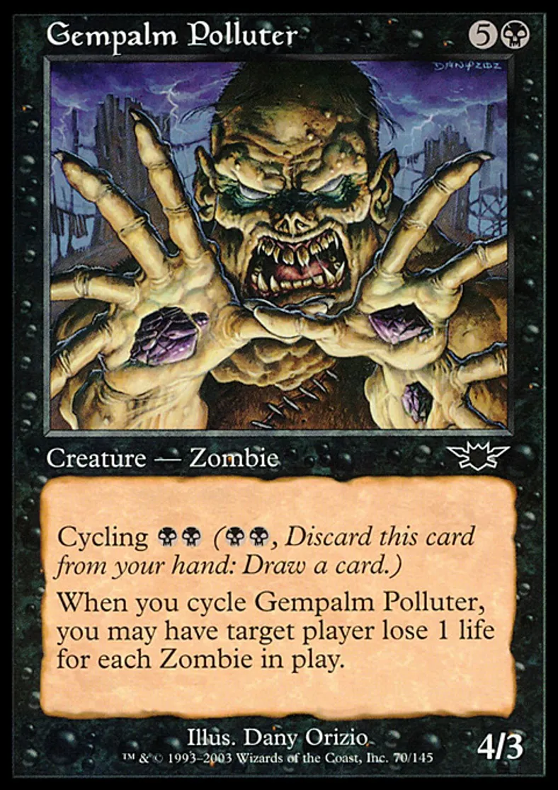 | Oracle Text | Cycling {{b}}{{b}} ({{b}}{{b}}, Discard this card: Draw a card.) When you cycle Gempalm Polluter, you may have target player lose life equal to the number of Zombies on the battlefield. | ||