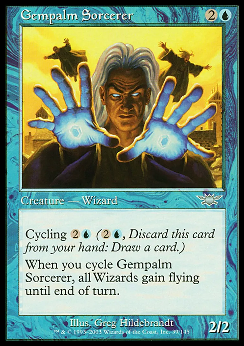 | Oracle Text | Cycling {{2}}{{u}} ({{2}}{{u}}, Discard this card: Draw a card.) When you cycle Gempalm Sorcerer, Wizard creatures gain flying until end of turn. | ||
