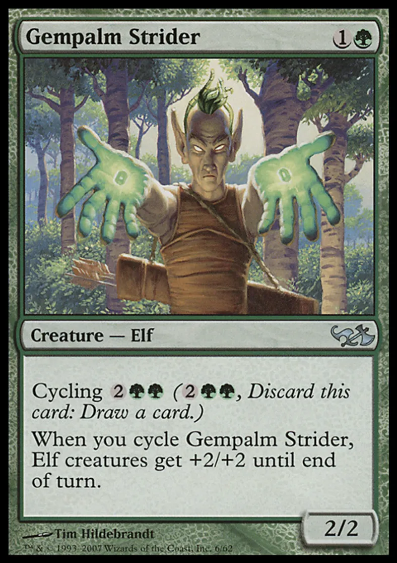 | Oracle Text | Cycling {{2}}{{g}}{{g}} ({{2}}{{g}}{{g}}, Discard this card: Draw a card.) When you cycle Gempalm Strider, Elf creatures get +2/+2 until end of turn. | ||